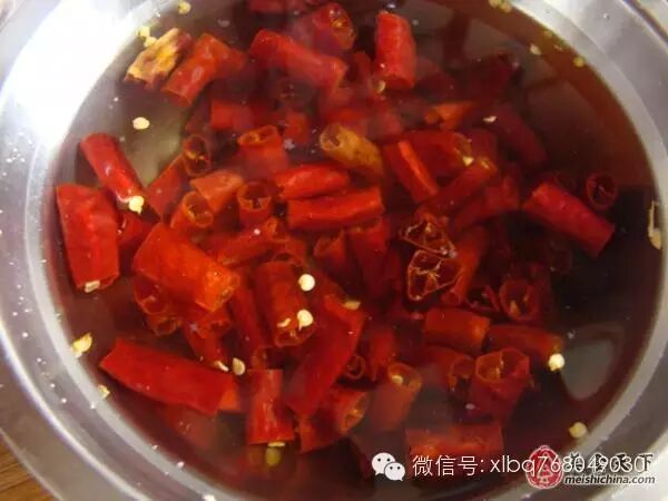 4,把辣椒皮泡在開水里半個(gè)小時(shí)。如嫌辣,就泡的時(shí)間長(zhǎng)一點(diǎn),中間換幾次熱水。