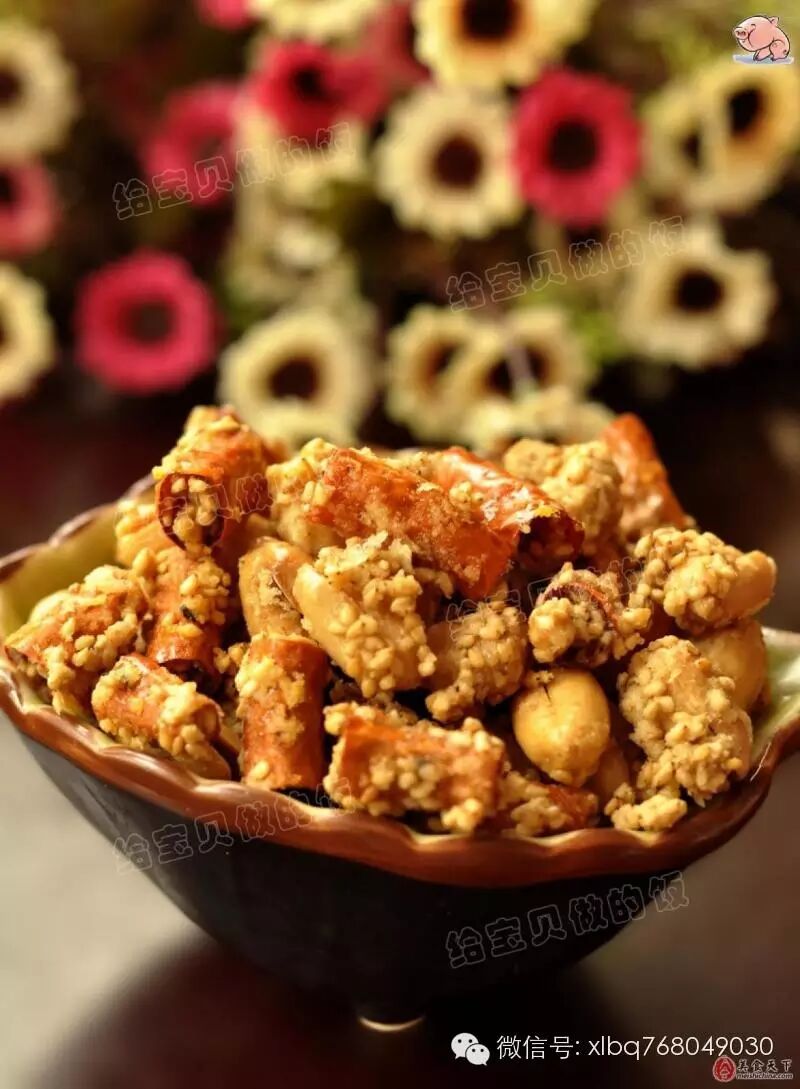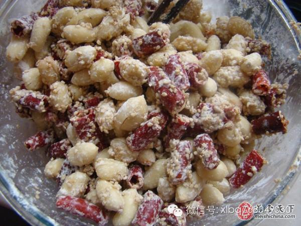原料:花生米、干紅辣椒、白芝麻、熱水、鹽、雞精、十三香、糯米粉或淀粉