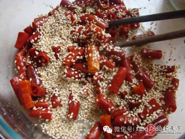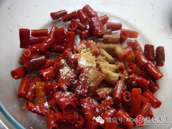 5,泡好的辣椒皮瀝凈水,放盆內(nèi),加入鹽、雞精、十三香拌勻。